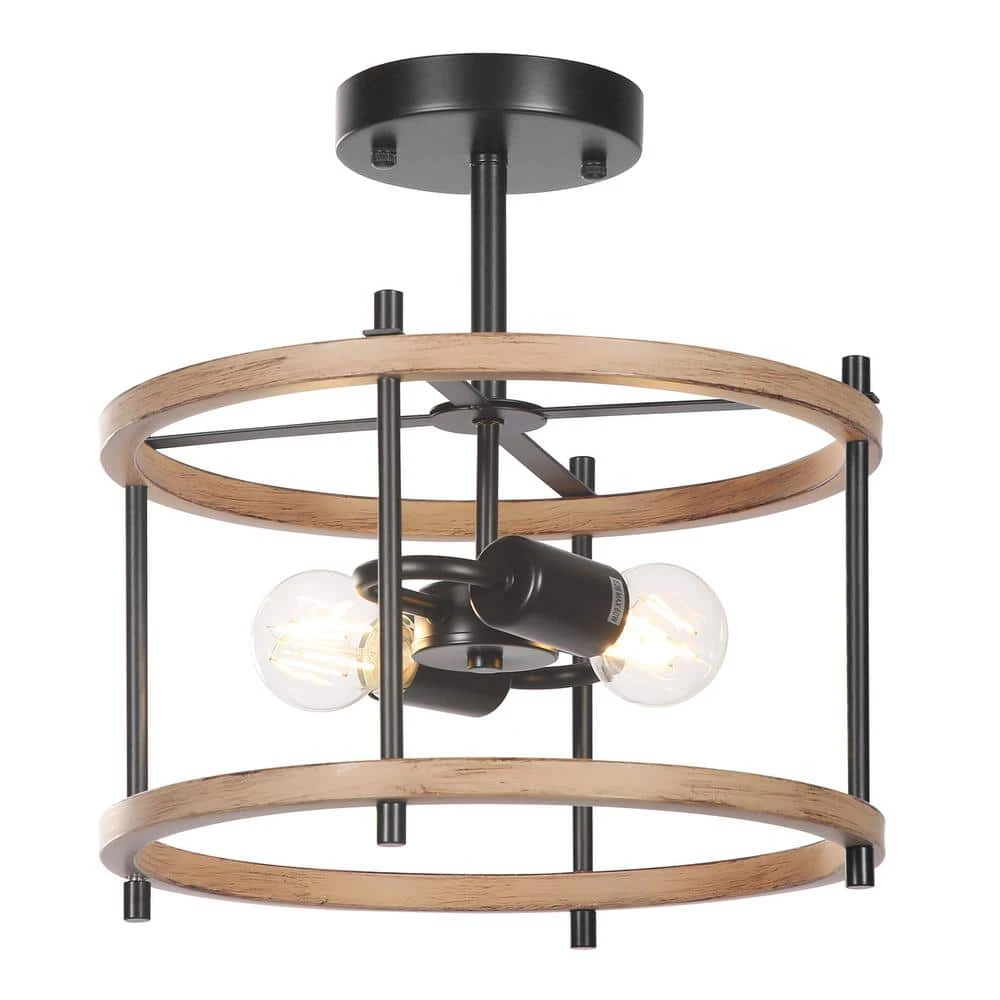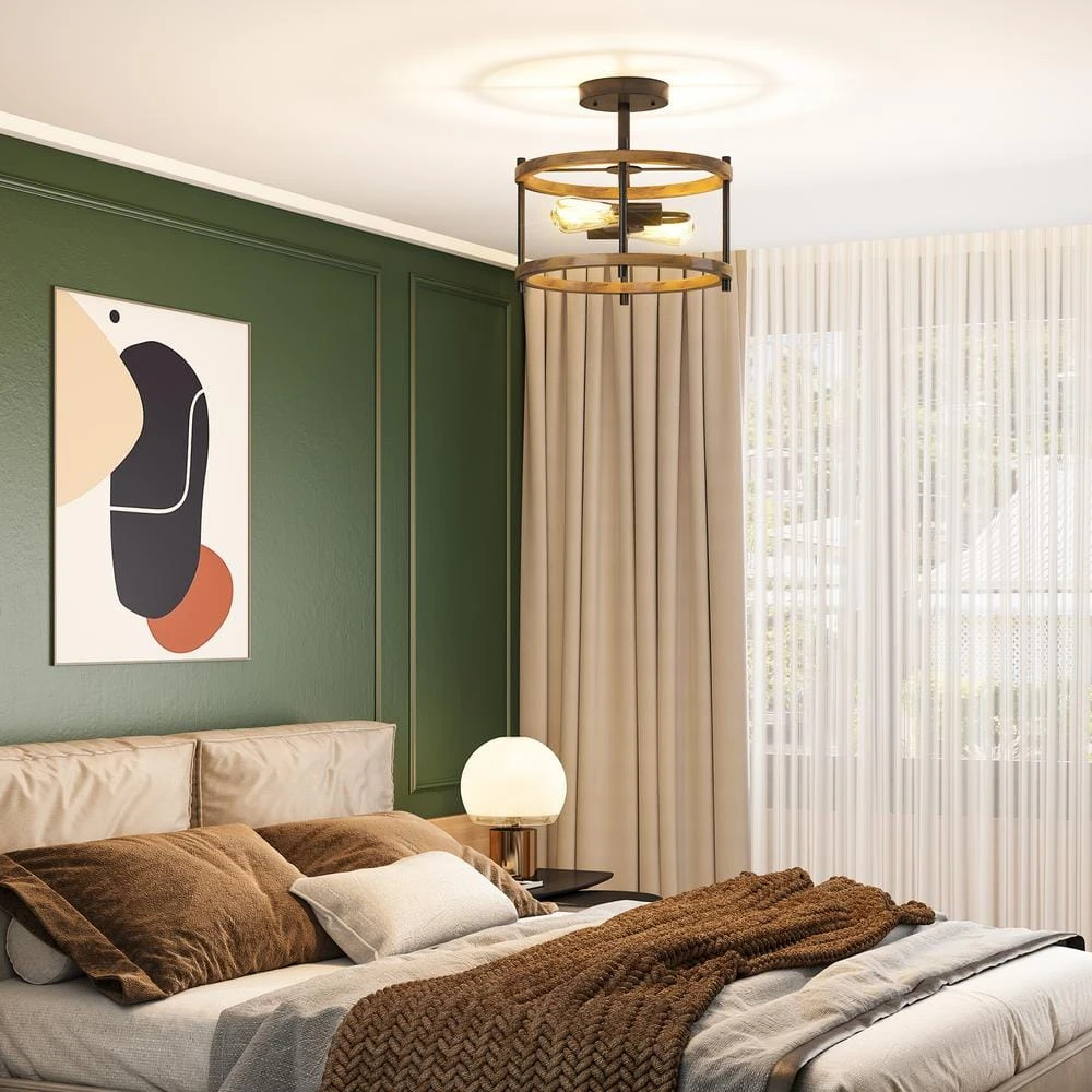 This elegant classic modern semi flush Light from the Crystal collection adds form and function to your home. The cylindrical shape light fixture features a metal frame with a rich painted black and Walnut wood brushed finish. This ceiling light based on the traditional design adopts the modern element. The manual made ring wire shape comes in staggering and completely showing the creative charm of modernity. Combining contemporary and industrial elements, this transitional light fixture is coated in high-quality finish, featuring a strong cast iron base in a solid structure for a minimalist life style. Perfect for the hallway, entry, porch, mudroom, stairwell, kitchen sink, closet, dining room, bedroom, living room, craft room, also an ideal choice for commercial areas, such as bar, cafe, hotel and restaurant.