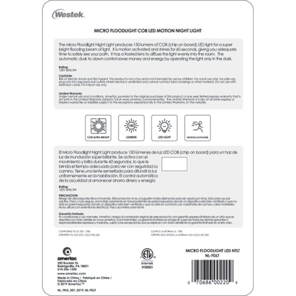 The Micro Floodlight Night Light produces 150 lumens of COB (chip on board) LED light for a super bright flooding beam of light. It is motion activated and shines for 60-seconds, giving you adequate time to safely see your path and is perfect for the garage or any room requiring high visibility in the dark. It has a frosted lens to diffuse the light evenly in the room. The automatic dusk to dawn control saves money and energy by operating the light only in the dark.