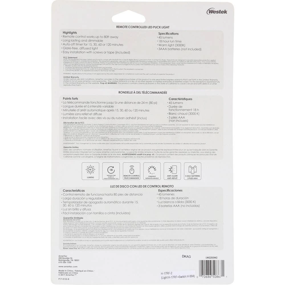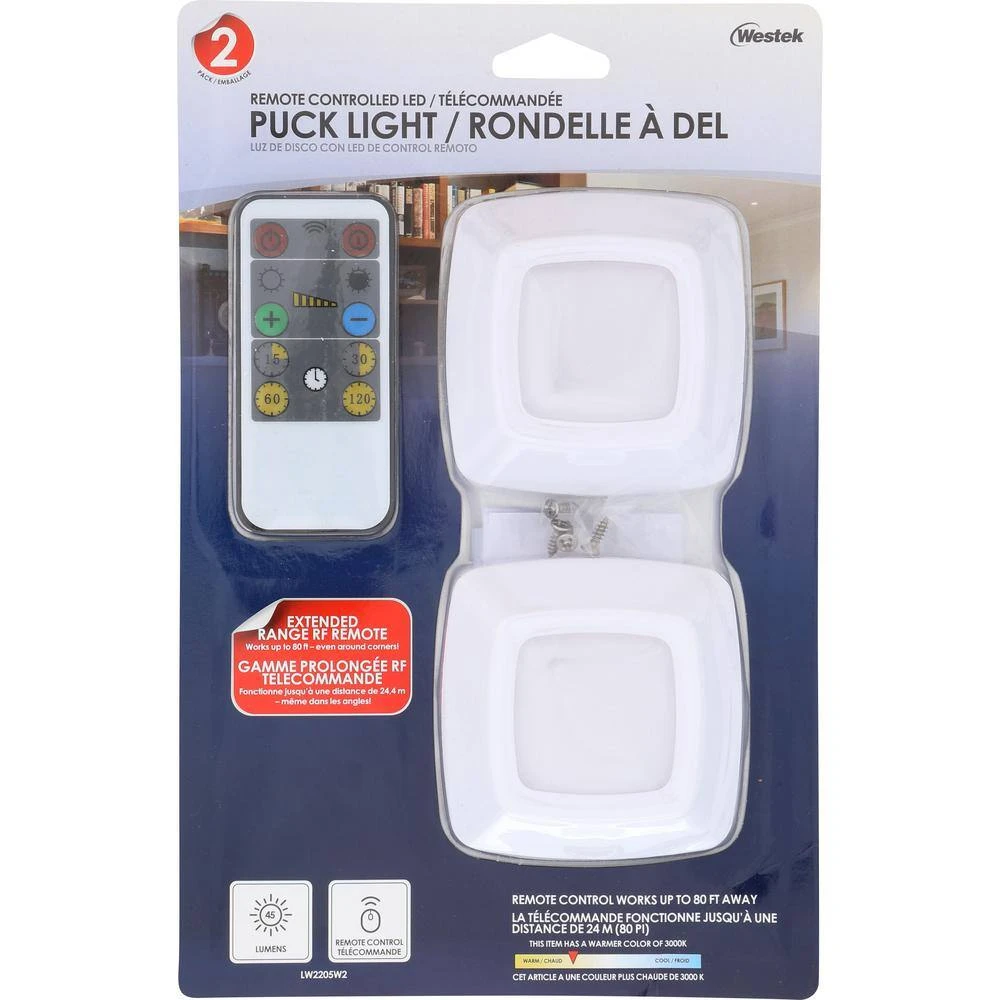 The Westek LW2205W-N2 LED Puck Lights are the perfect way to add illumination to any space. The slim profile design works great under a cabinet, over a workspace or in your living room. This fixture projects 45 lumens of glare-free, diffused light with a dim mode for low light needs. Remote operated with an auto off timer you can set for 15, 30, 60 or 120 minutes. Installation is easy with the included double sided tape and screws that allow for you to mount this light where you need it most. This device is powered by 3 AAA batteries (not included) and has a run time of 18 hours. AmerTac manufacturing brands offer complete lines of distinctive decorative home accent products that include trend-setting wall plates, money saving LED night lights, innovative under cabinet lighting and LED battery operated lights. We also offer utility product lines including energy-saving timers, dimmers and lighting controls, as well as an extensive offering of consumer electronics accessories for the home and office.