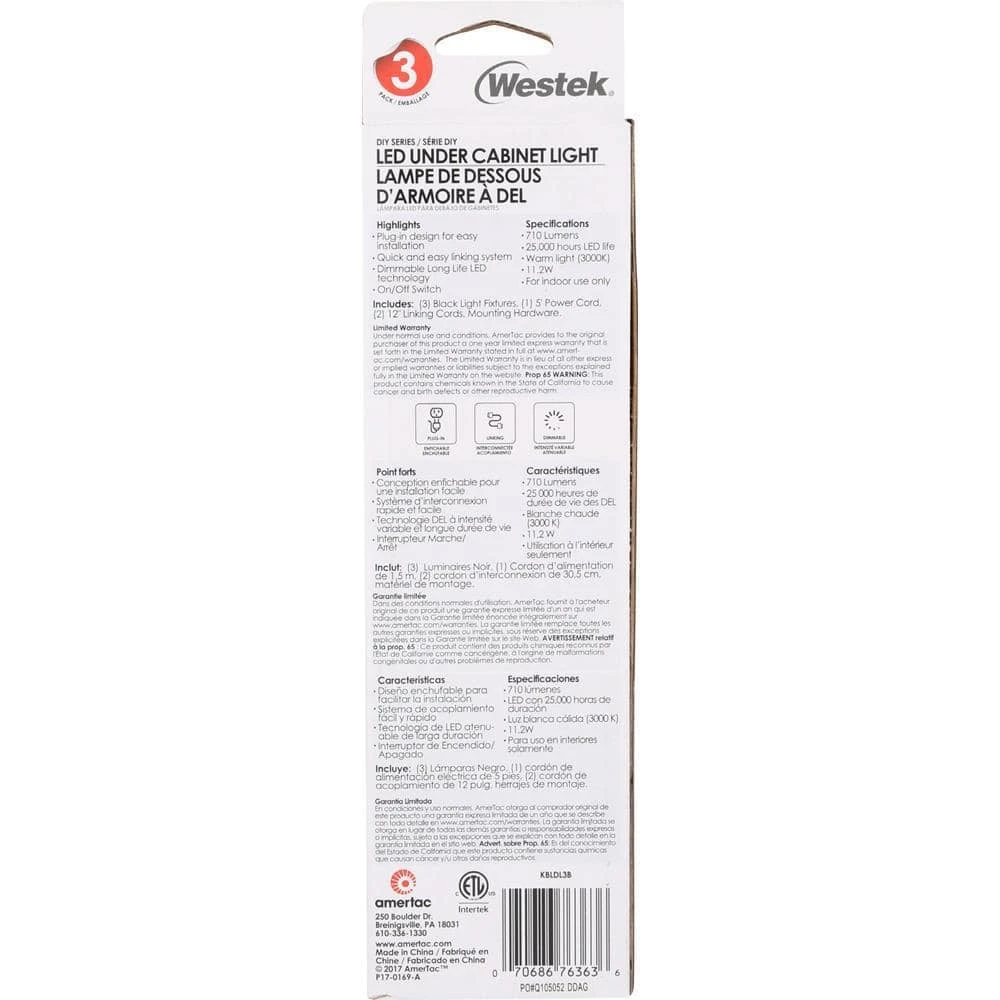 The Westek KBLD-L3B-N1 KBLD LED Puck Light is the perfect way to add illumination to any space. Works great under a cabinet, over a workspace or in a closet. These fixtures have a frosted diffuser and provide a combined 710 lumens of warm white light wherever you need it. Easy, DIY plug-in installation with the included mounting hardware and 5′ power cord. The included 12″ linking cords allows for multiple units to be powered by a single outlet. Operates with an in-line on/off switch. AmerTac manufacturing brands offer complete lines of distinctive decorative home accent products that include trend-setting wall plates, money saving LED night lights, innovative under cabinet lighting and LED battery operated lights. We also offer utility product lines including energy-saving timers, dimmers and lighting controls, as well as an extensive offering of consumer electronics accessories for the home and office.