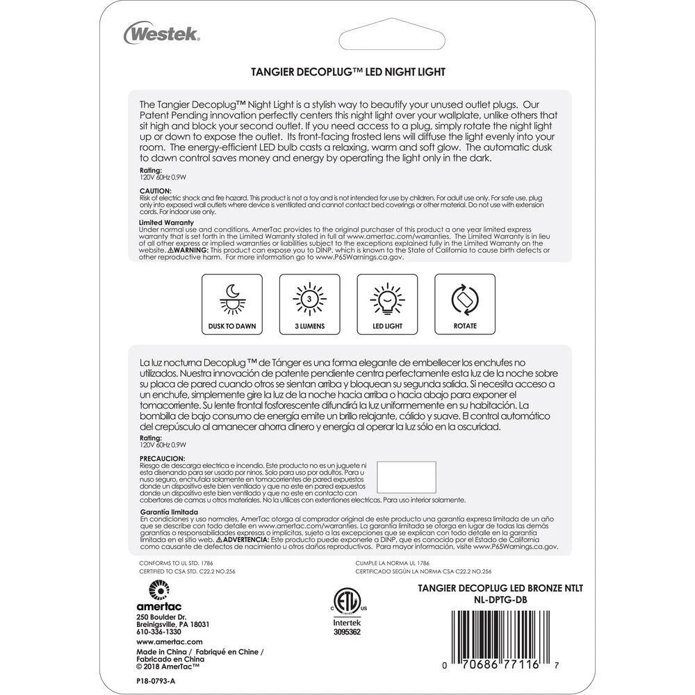 The Westek NL-DPTG-DB Tangier Decoplug Night Light is the perfect night time lighting solution. This device automatically turns on in low light providing 2 lumens of illumination. Designed with a tangier pattern design and an aged bronze finish that works with any decor. The innovative cover hides outlet plugs from view and flips up when needed. Great for hallways, entryways, basements, bathrooms and more. AmerTac manufacturing brands offer complete lines of distinctive decorative home accent products that include trend-setting wall plates, money saving LED night lights, innovative under cabinet lighting and LED battery operated lights. We also offer utility product lines including energy-saving timers, dimmers and lighting controls, as well as an extensive offering of consumer electronics accessories for the home and office.