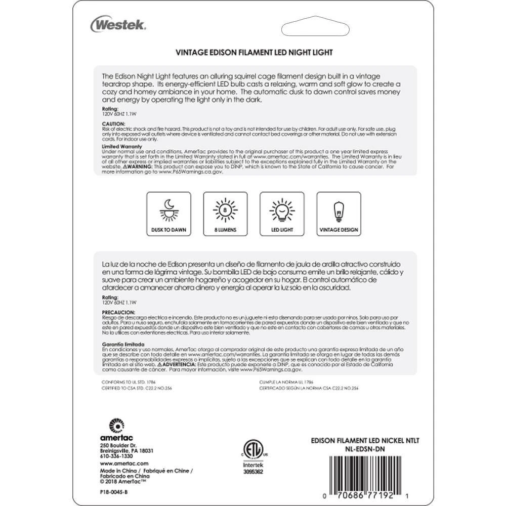 The Westek NL-EDSN-DN Automatic Vintage Edison Light is the perfect night time lighting solution. This device automatically turns on in low light conditions, projecting 8 lumen of warm, amber light. The LED filament has a vintage design that makes for an excellent accent light and adds a 19th century flair to any room. Great for hallways, entryways, basements and more. AmerTac manufacturing brands offer complete lines of distinctive decorative home accent products that include trend-setting wall plates, money saving LED night lights, innovative under cabinet lighting and LED battery operated lights. We also offer utility product lines including energy-saving timers, dimmers and lighting controls, as well as an extensive offering of consumer electronics accessories for the home and office.