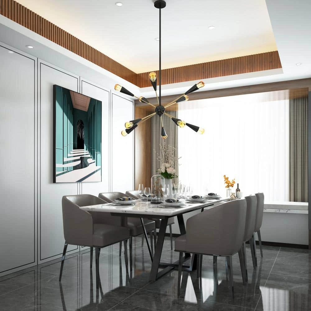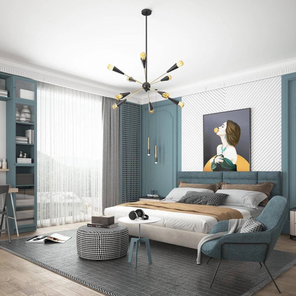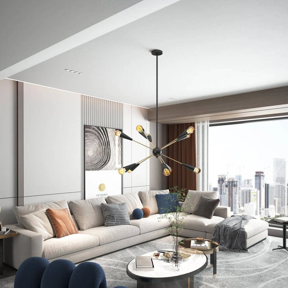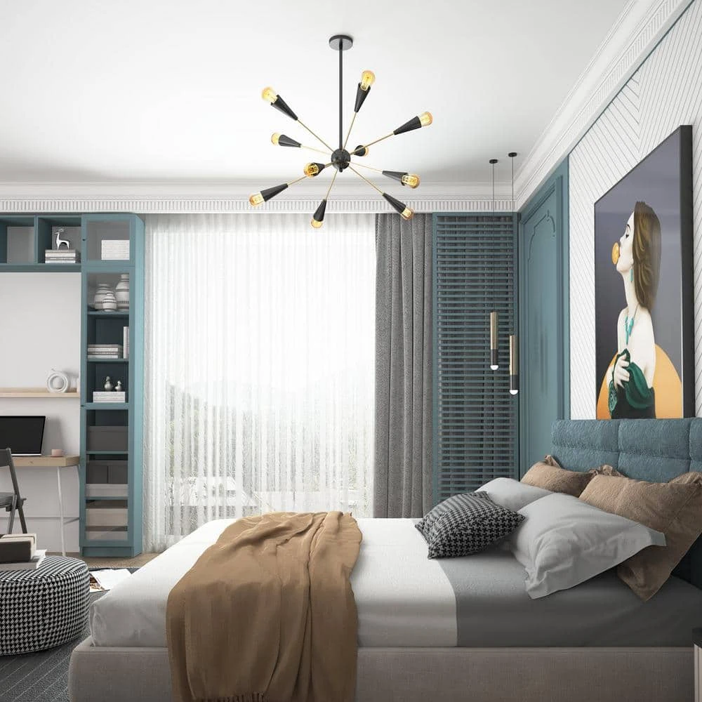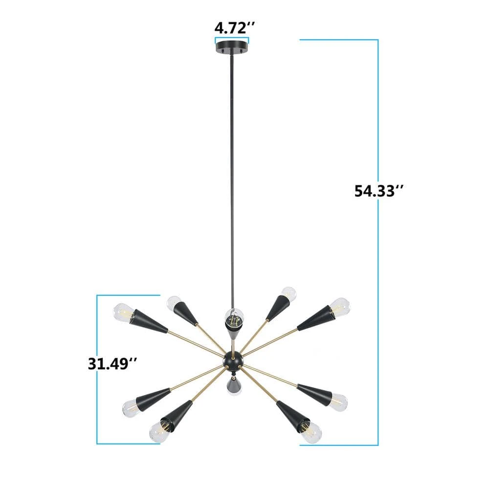 Crafted from matter black finish rod with brass symmetric arms, this 10-light chandelier lighting brims with modern industrial sputnik style that elevates the look of any place. 10 linear arms that just out from the center with a socket on the end of arms to accommodate any LED, CFL, incandescent bulbs. Blending the contemporary with the elegant by its unique geometric design, this luminary fits a diverse home spaces like bedroom, living room or dining room and so on.