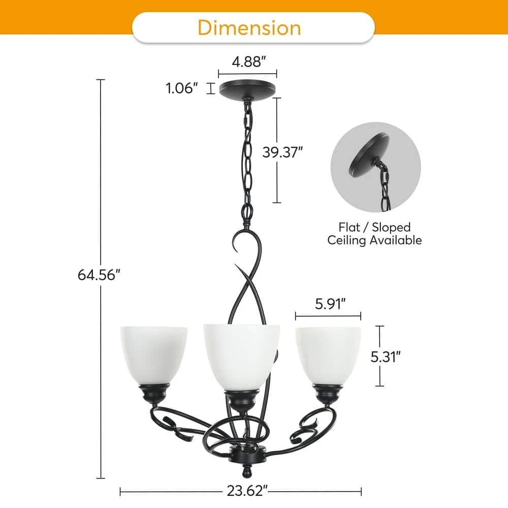 - Height Adjustable the 3-light chandelier comes with a height-adjustable chain to suit different house heights, chain height adjustable Range: 0.79 in. Min~39.37 in. Max, overall product Size: 23.62 in. W x 64.56 in. H (Max)