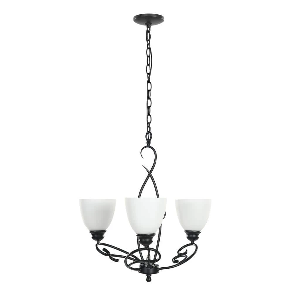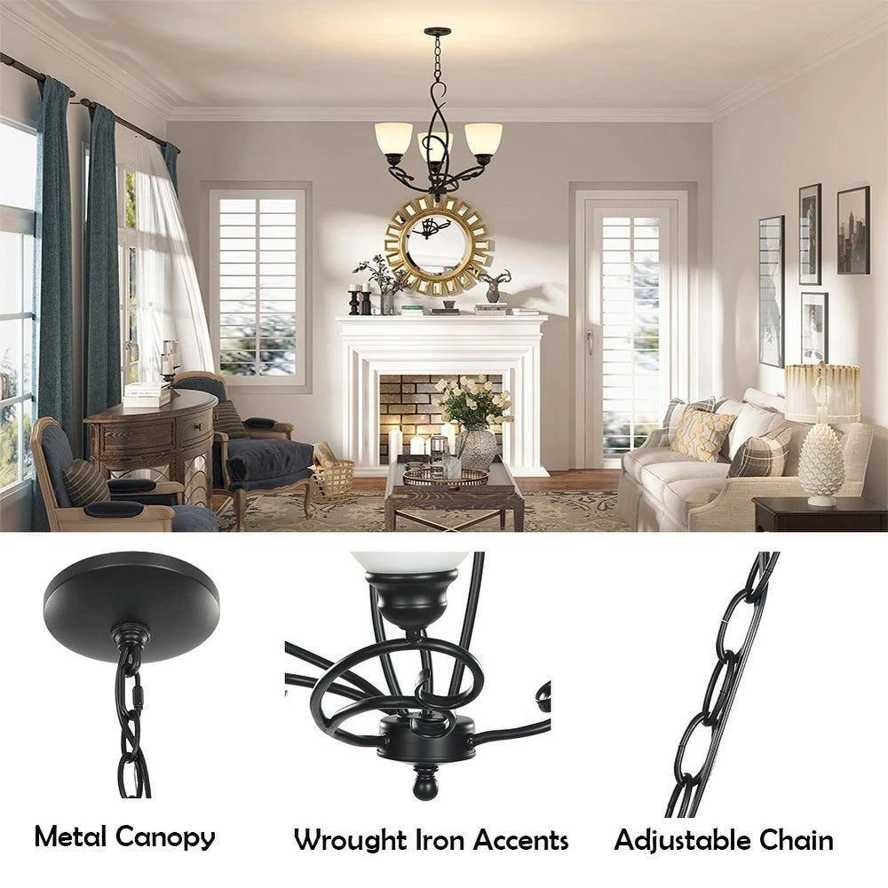 This elegant classic Farmhouse Chandelier Pendant Light adds form and function to your home. The 3 classic flower design lights fit nicely with the matte black metal tube. This chandelier based on the traditional design adopts the modern geometric element. With its streamlined silhouette and wrought iron, this metal fixture is sure to make a splash in any space inside your home.Combining contemporary and industrial elements, this transitional light fixture is coated in high-quality finish, featuring a strong hanging chain in a solid matal structure for a minimalist life style.