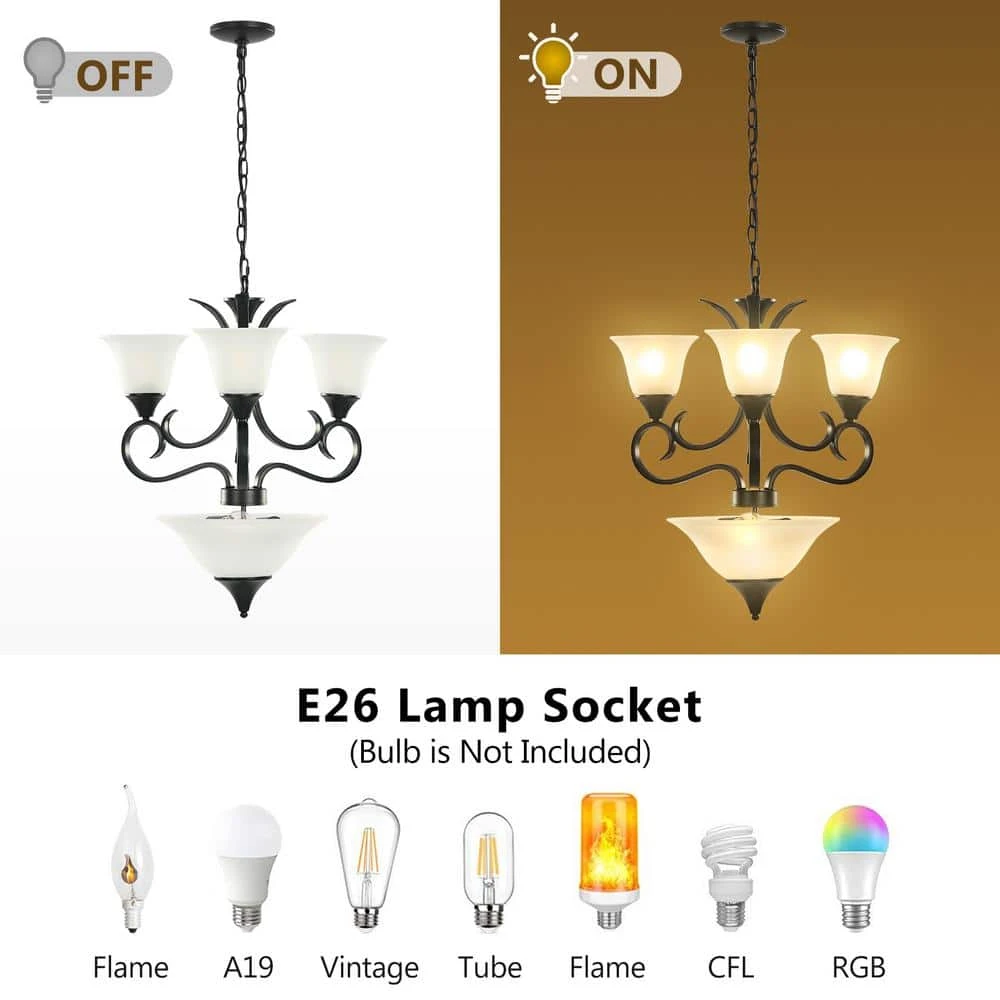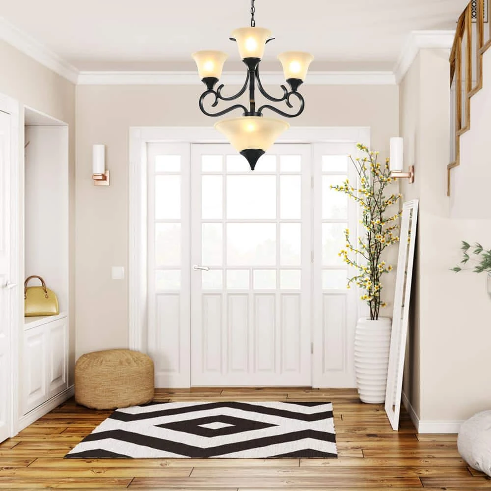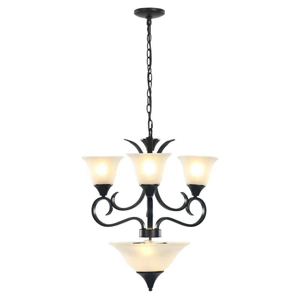 This 4-Light Black 2-Tier Chandelier with Bell Opaline Glass Shape is from TRIBESIGNS WAY TO ORIGIN Bailey collection. This 2-tier chandelier could integrate well with many kinds of home decor, the matte black metal finish matching the white glass shape is modern style, while the curved lights poles and bell shape give this item coastal style, all the designs make this light become the perfect chandelier for living room, bedroom, dining room, foyer, and kitchen island. All electrical accessories for our light are UL listed, superior metal frame, thicken metal base in black spray painting, make this light stable, anti-rust, and no fading. Our brand TRIBESIGNS WAY TO ORIGIN aim to provide beautiful and practical lights for you, you can always trust us.
