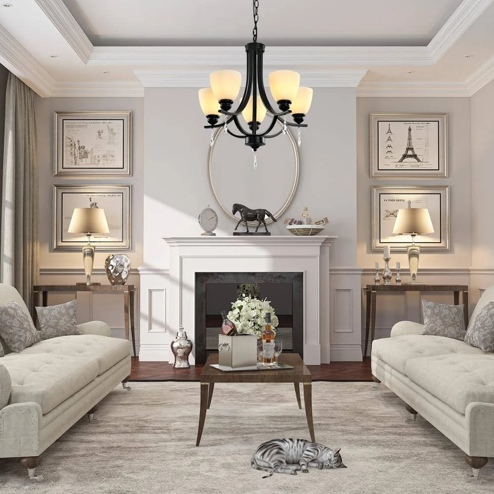 - Complimented with 5 elegant frosted glass shades, giving this chandelier the status of antique ambiance while bringing warm breath your any home space