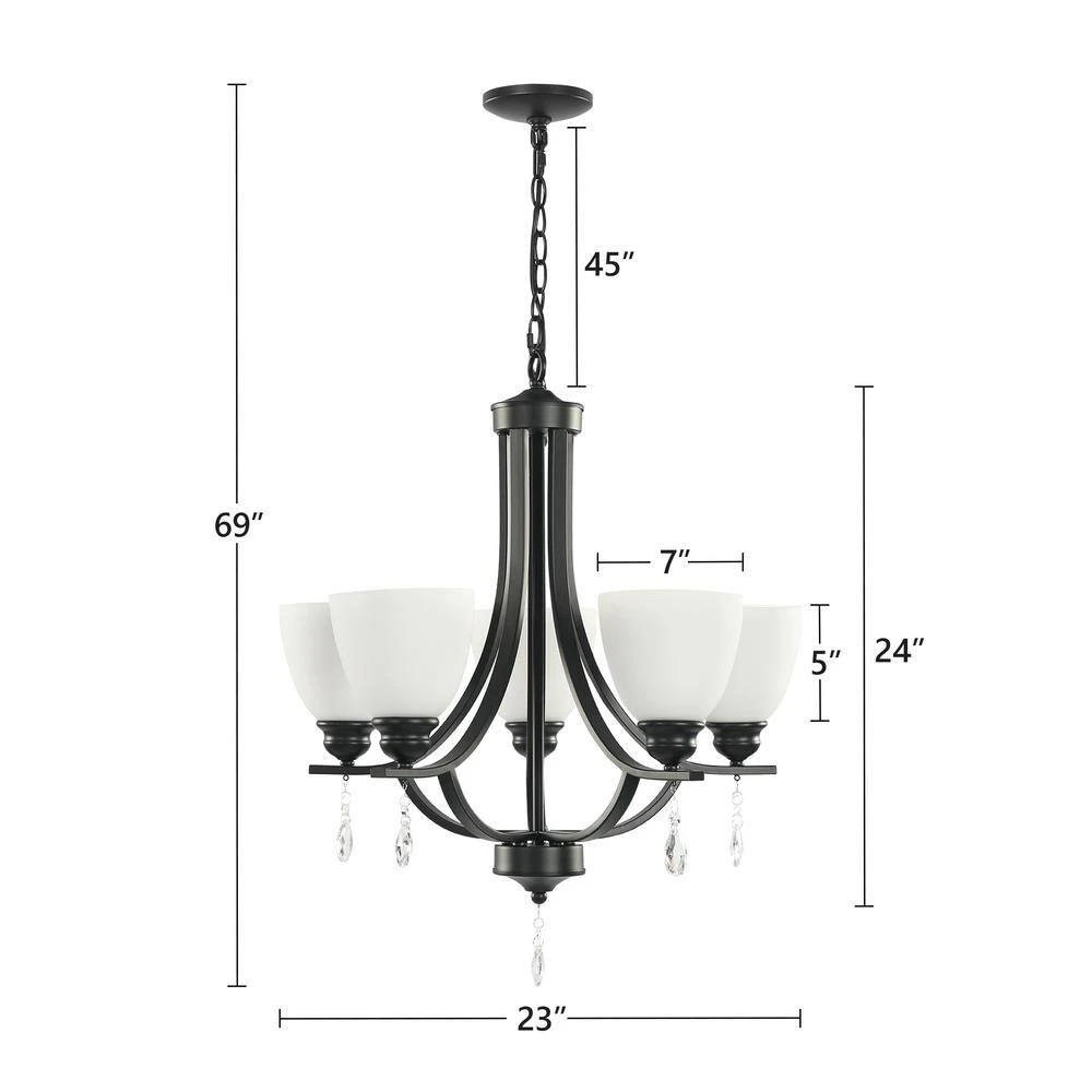 - Adjustable height: this black chandelier light fixture size is 23 in. D x 23 in. W x 69 in. H, the glass shade size: 5 in. Dia, it can work on sloped or vaulted ceiling, which comes with a 45 in. adjustable chain allowing you to adjust height to 45 in. maximum