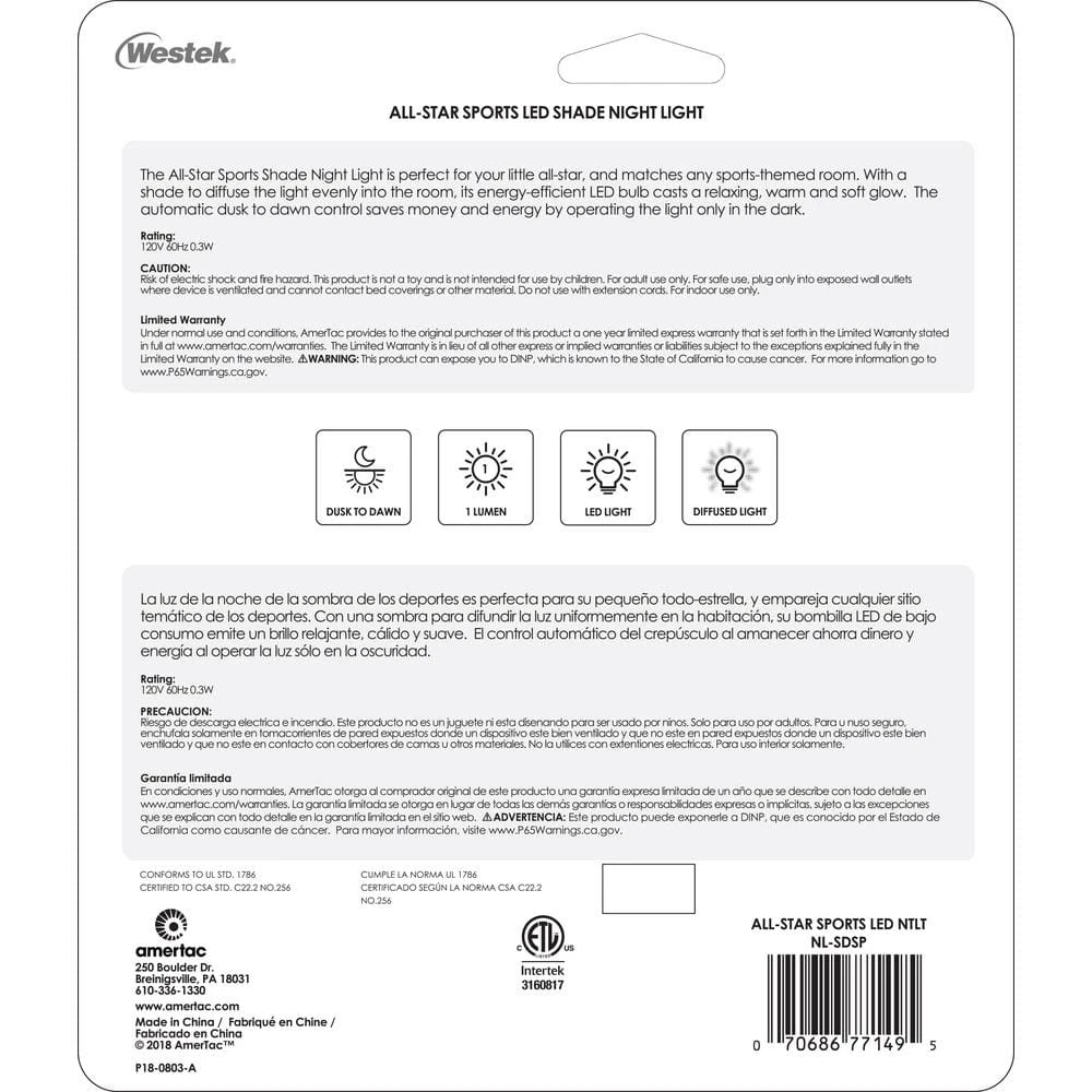 The Amerelle NL-SDSP All Star Shade Night Light is a fun way to brighten up any space. 1 lumen of warm illumination is projected through a sports themed design. This device automatically turns on in low light; adding safety and security. Great for bedrooms, playrooms or anywhere you need some whimsical flair. AmerTac manufacturing brands offer complete lines of distinctive decorative home accent products that include trend-setting wall plates, money saving LED night lights, innovative under cabinet lighting and LED battery operated lights. We also offer utility product lines including energy-saving timers, dimmers and lighting controls, as well as an extensive offering of consumer electronics accessories for the home and office.