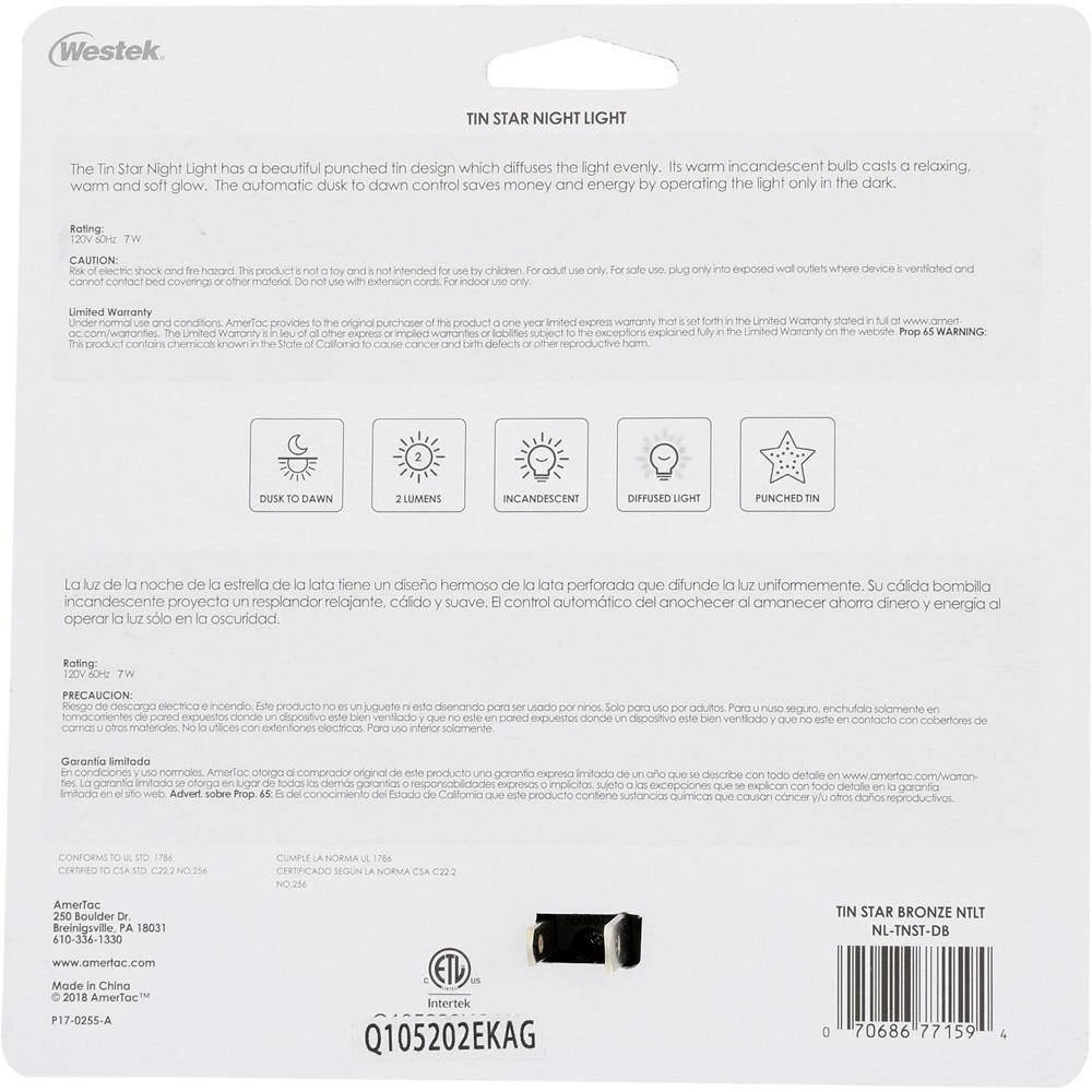 The Westek NL-TNST-DB Tin Star Automatic Light is the perfect night time lighting solution. This device automatically turns on in low light; projecting 2 lumens of warm illumination; enough to see by without being obtrusive. Great for hallways, entryways, basements, bathrooms and more. The punched tin design and bronze finish works with any decor. AmerTac manufacturing brands offer complete lines of distinctive decorative home accent products that include trend-setting wall plates, money saving LED night lights, innovative under cabinet lighting and LED battery operated lights. We also offer utility product lines including energy-saving timers, dimmers and lighting controls, as well as an extensive offering of consumer electronics accessories for the home and office.