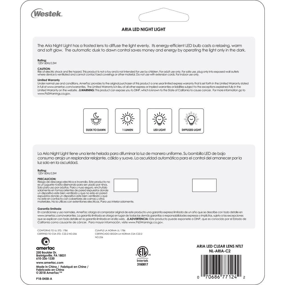 The Westek NL-ARIA-C2 Aria Curve Night Light is the perfect night time lighting solution. This device automatically turns on in low light with 1 lumen of vivid illumination through a clear lens; enough to see by without being obtrusive. Great for hallways, entryways, basements, bathrooms and more. Designed with a modern style that works with any decor. AmerTac manufacturing brands offer complete lines of distinctive decorative home accent products that include trend-setting wall plates, money saving LED night lights, innovative under cabinet lighting and LED battery operated lights. We also offer utility product lines including energy-saving timers, dimmers and lighting controls, as well as an extensive offering of consumer electronics accessories for the home and office.