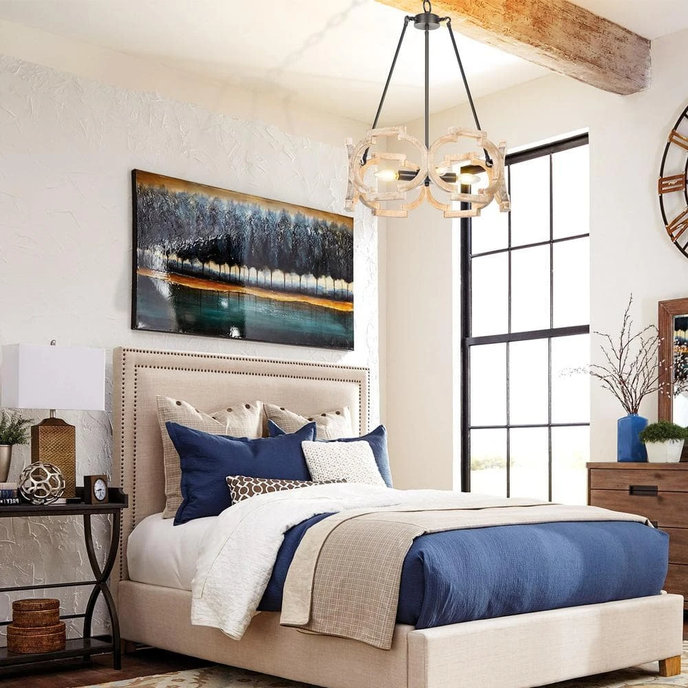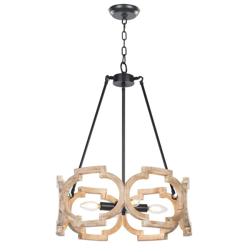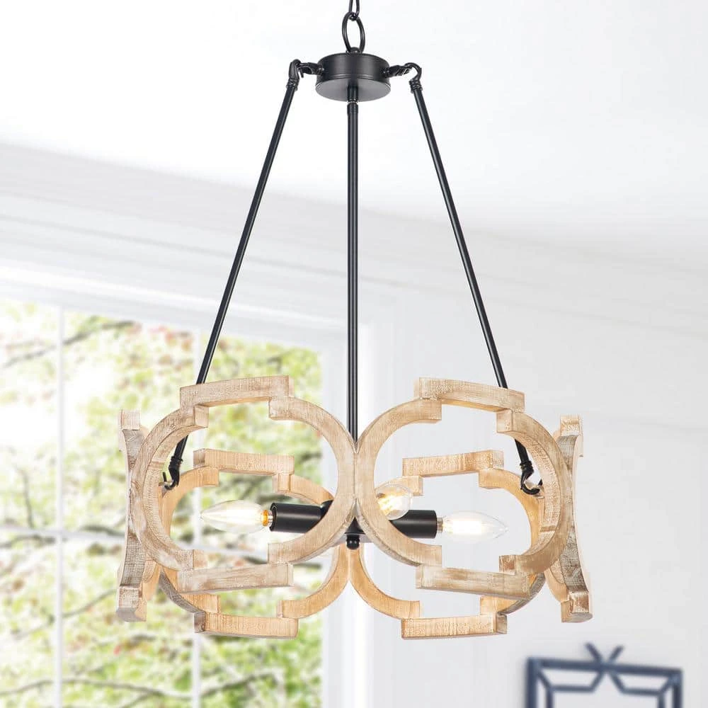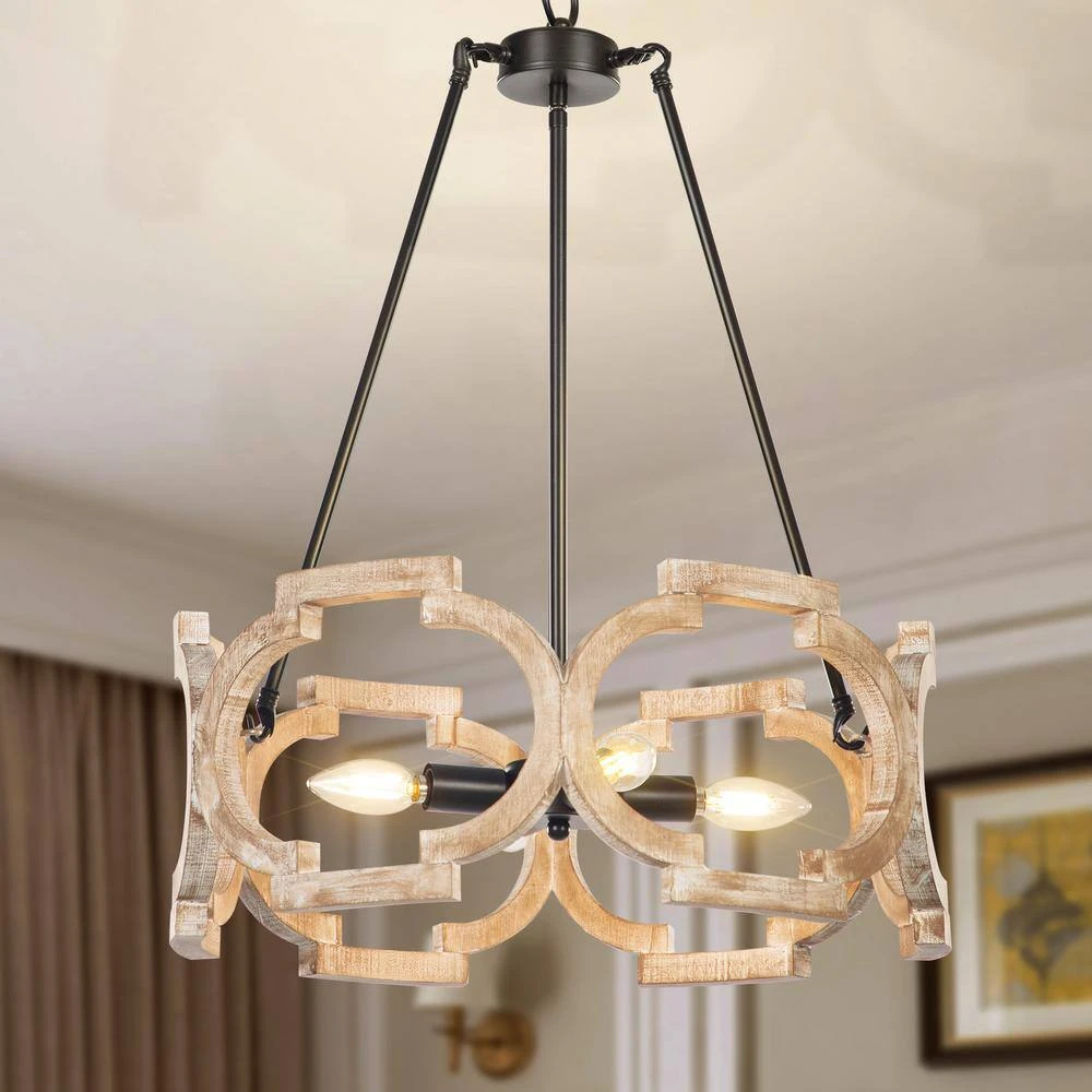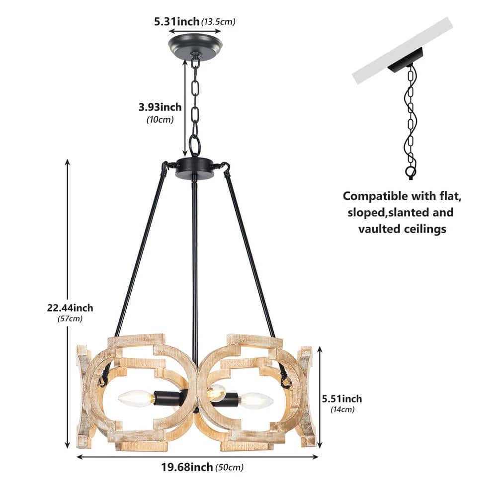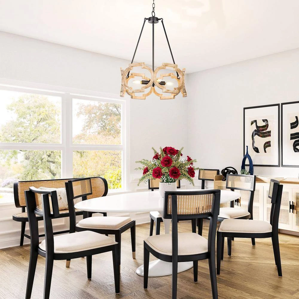 Lend a touch of retro charm to your room with this unique 4-Light black modern farmhouse mini pendant light transitional ceiling mounted light with open wooden lampshade. Finished in brown and featured hand-painted wooden shade with ceramic sockets. This Crystal island pendant light creates perfect blend with other home decors, including lodge, modern, traditional, industrial and more. With a single or a pair of this rustic chandelier to refresh your lovely home.