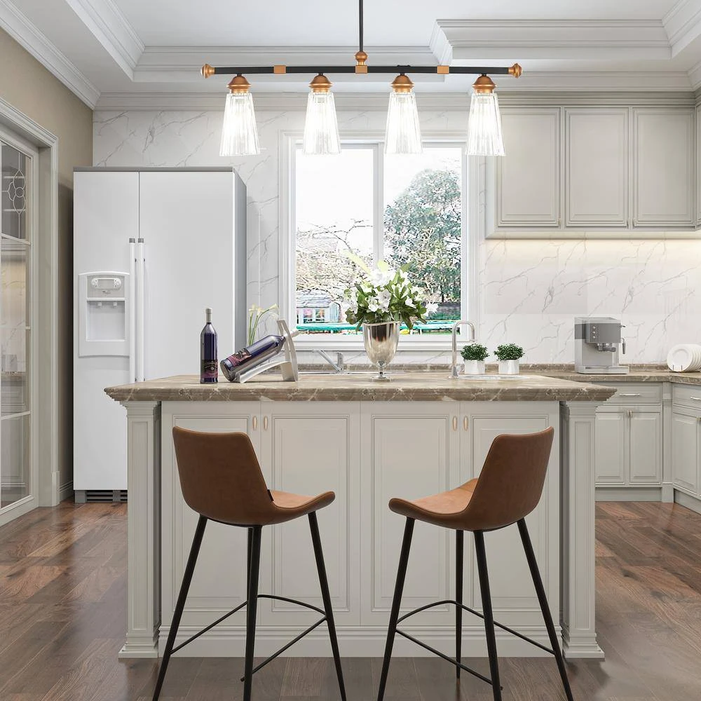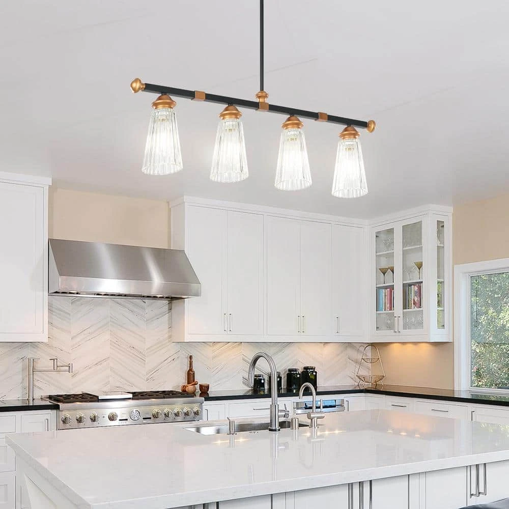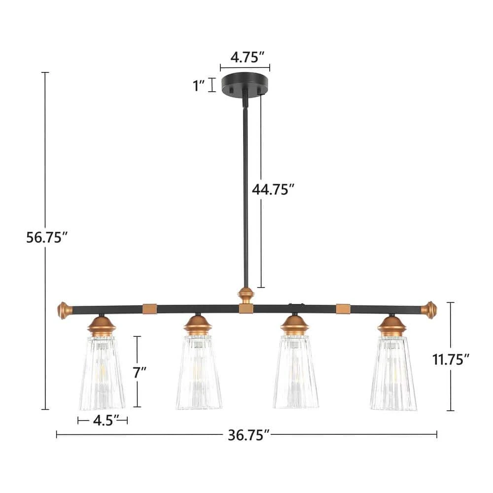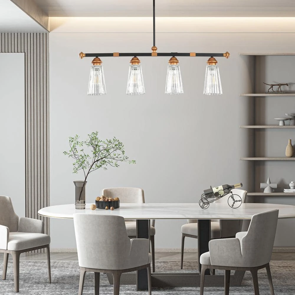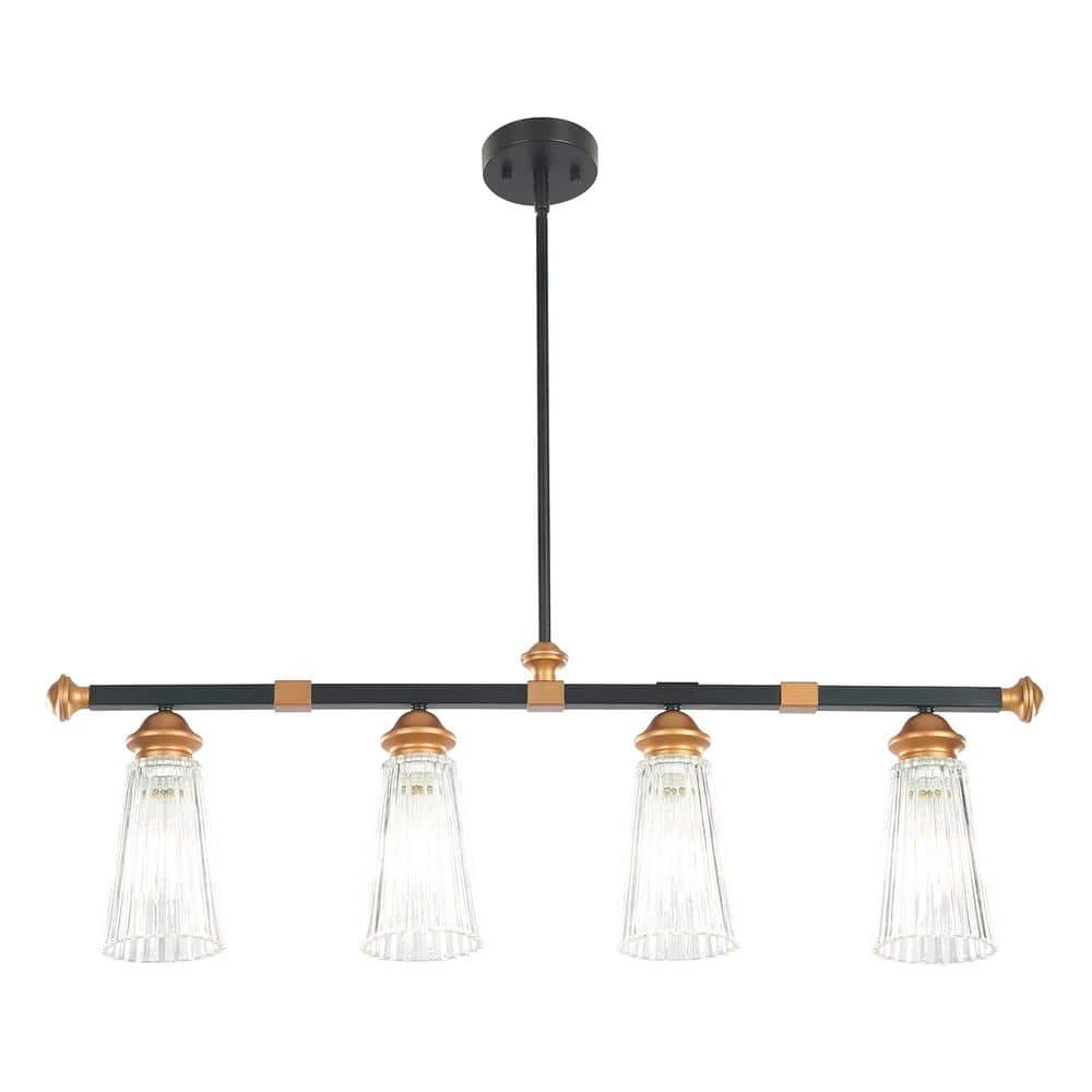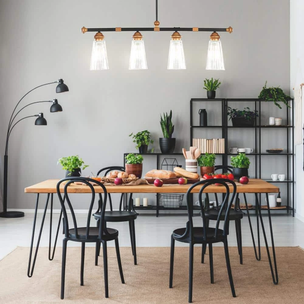 - Modern industrial-style 4-shine show shows retro, elegant style, matte black and brass embellishment long support arm through the base and elegant suspension make the light look more beautiful, the following 4 vertical striped glass lampshade, spread the light into your space