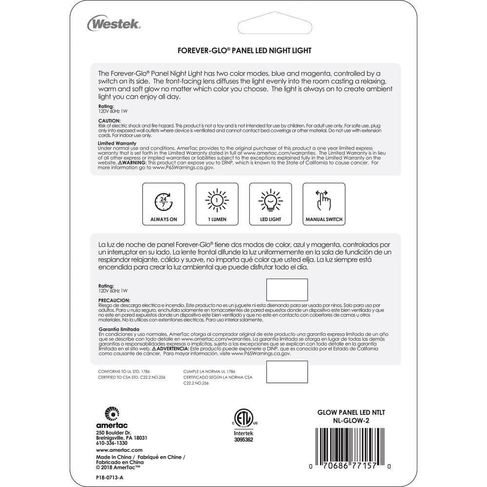The Westek NL-GLOW-2 Forever Glo Panel Light is perfect in bedrooms, entryways, bathrooms, hallways, basements, attics or any area where you need light. Designed with a small, compact housing that fits wherever you need it and stays cool to the touch. This always on light is a great way to add safety and security to any space. Projects 1 lumen of light; enough to see by without being obtrusive. Users can select soothing blue or magenta light with the flick of a switch. AmerTac manufacturing brands offer complete lines of distinctive decorative home accent products that include trend-setting wall plates, money saving LED night lights, innovative under cabinet lighting and LED battery operated lights. We also offer utility product lines including energy-saving timers, dimmers and lighting controls, as well as an extensive offering of consumer electronics accessories for the home and office.