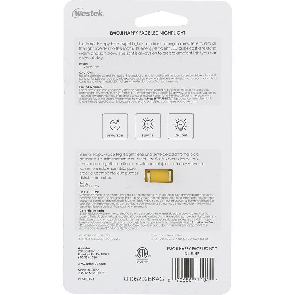 The Amerelle NL-EJBK Blowing Kiss Emoji Light is a fun way to brighten up any space. 1 lumen of warm illumination is projected through the friendly face for you to enjoy all day with this always on light. Great for bedrooms, playrooms or anywhere you need some whimsical flair. AmerTac manufacturing brands offer complete lines of distinctive decorative home accent products that include trend-setting wall plates, money saving LED night lights, innovative under cabinet lighting and LED battery operated lights. We also offer utility product lines including energy-saving timers, dimmers and lighting controls, as well as an extensive offering of consumer electronics accessories for the home and office.