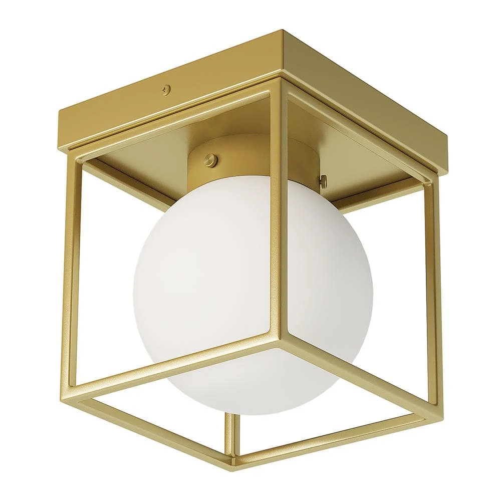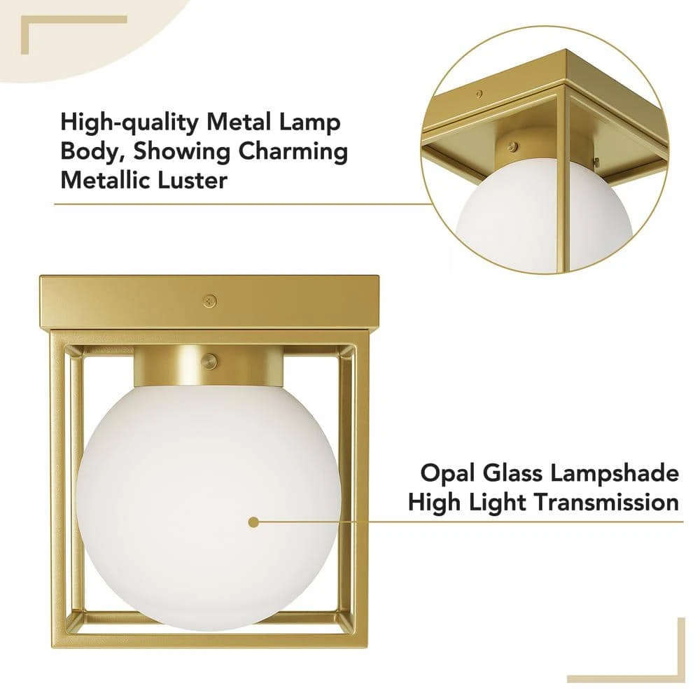 Add some classic charm with this flush mount ceiling light that features a gold finish frame and soft opal glass globe. Contemporary, geometric design elements define the look of the ceiling light. This flush mount is simple, yet refined, with a structured frame surrounding opal glass. It comes in a brilliant plated gold finish for a stylish look of luxury, which is the perfect choice for updating your home.