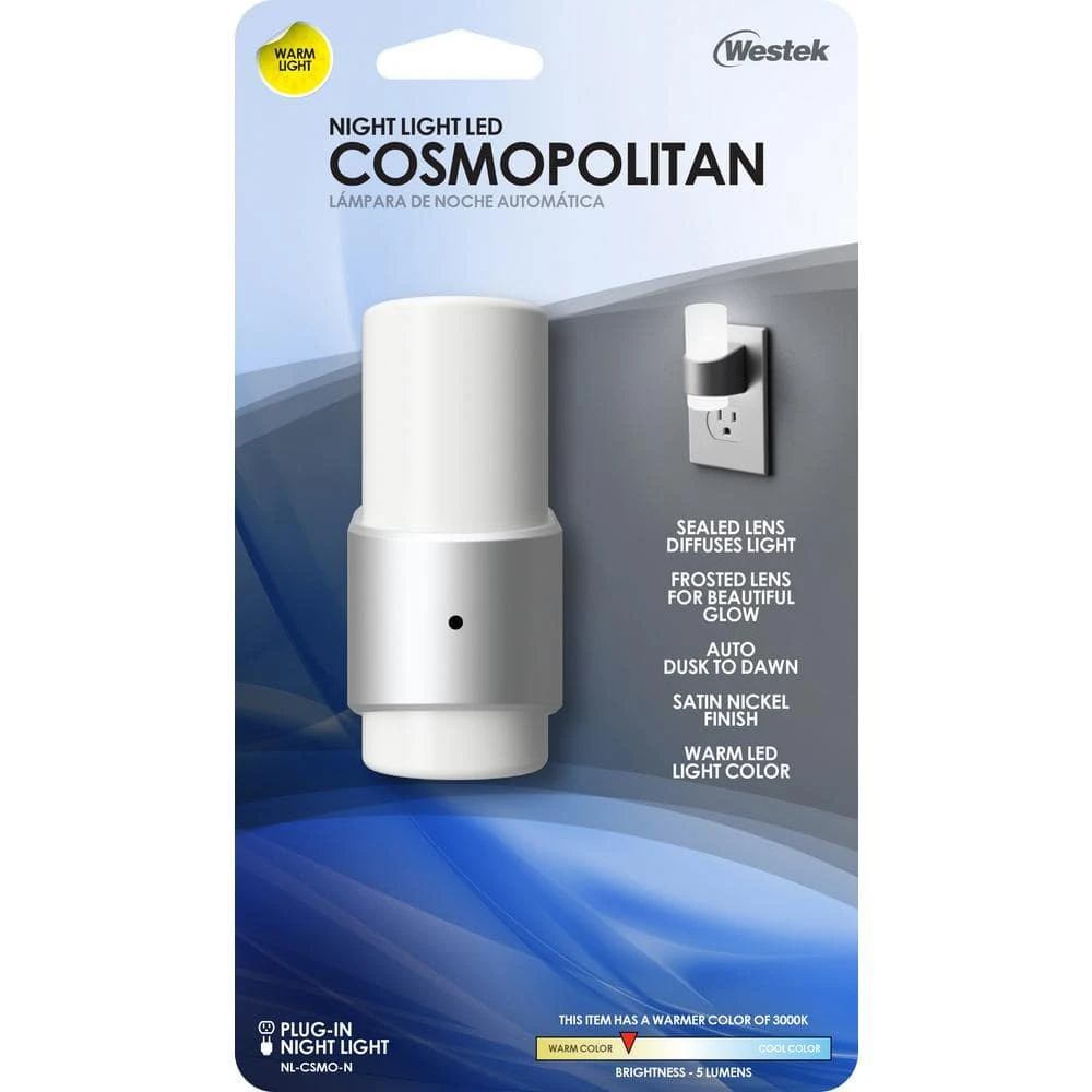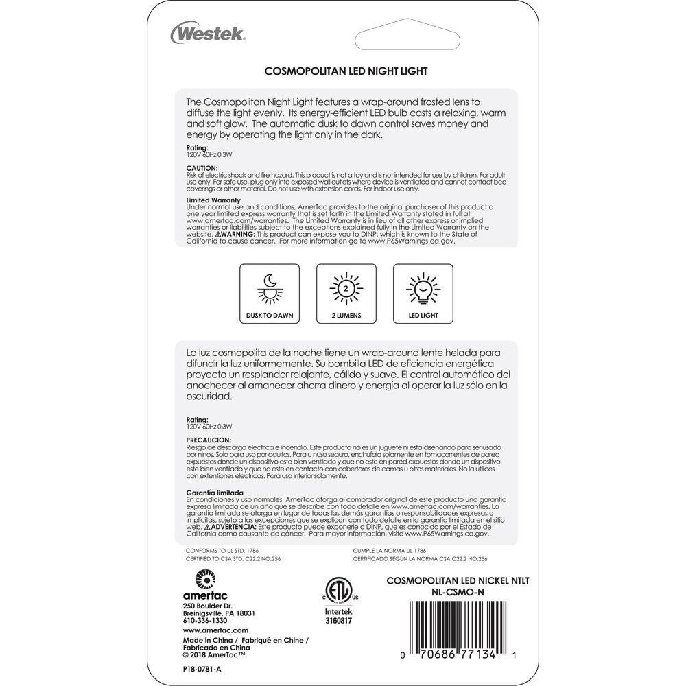 The Westek NL-CSMO-N Cosmopolitan Automatic Light is the perfect night time lighting solution. This device automatically turns on in low light providing 5 lumens of warm illumination through a sealed lens. Great for hallways, entryways, basements, bathrooms and more. Designed with a transitional style and nickel finish that works with any decor. AmerTac manufacturing brands offer complete lines of distinctive decorative home accent products that include trend-setting wall plates, money saving LED night lights, innovative under cabinet lighting and LED battery operated lights. We also offer utility product lines including energy-saving timers, dimmers and lighting controls, as well as an extensive offering of consumer electronics accessories for the home and office.