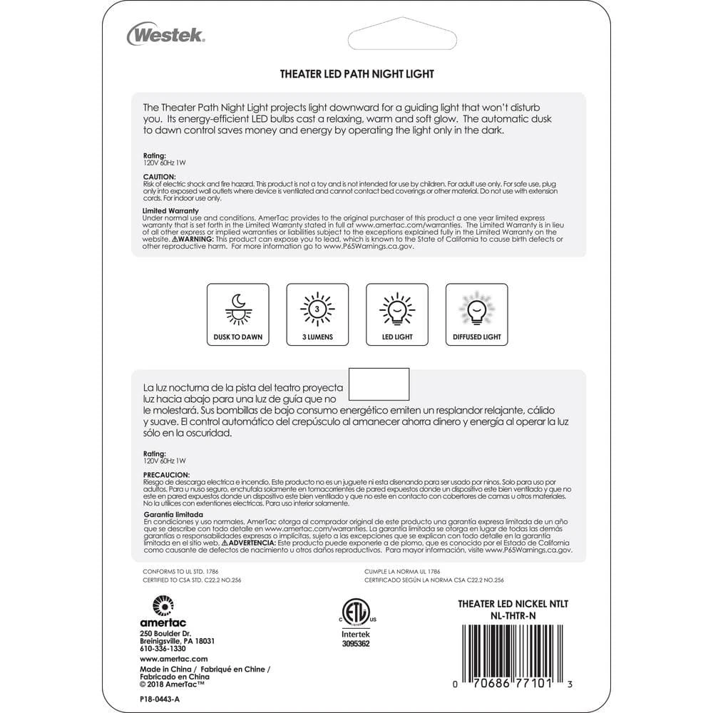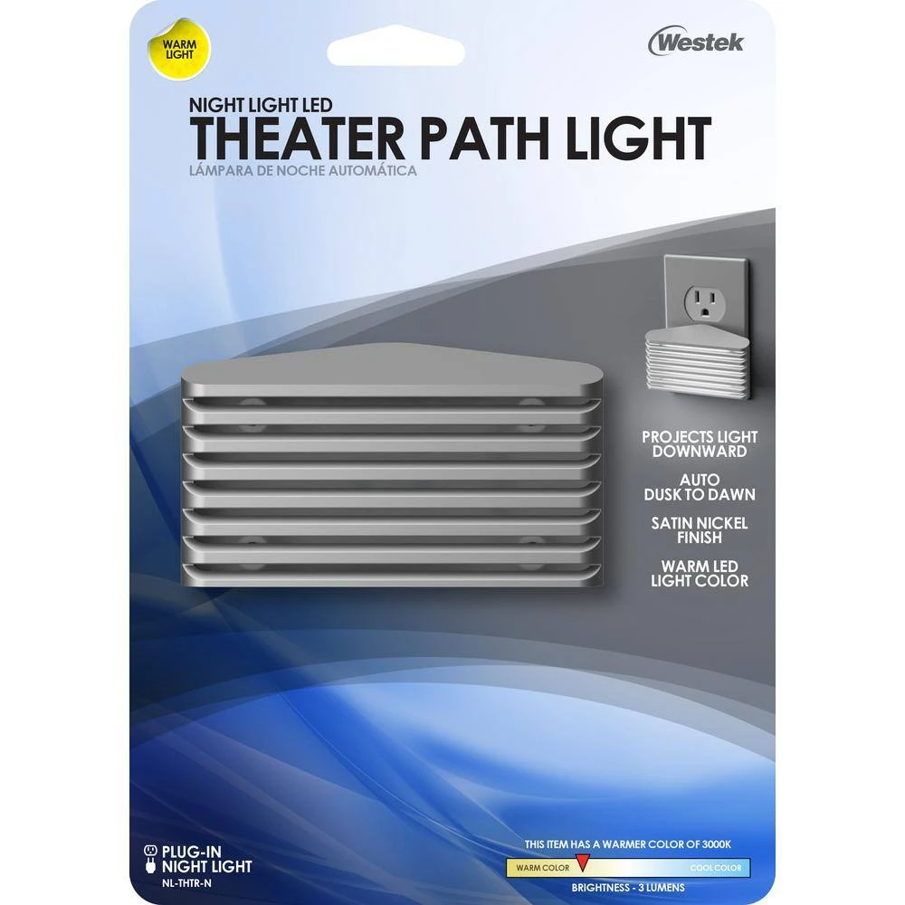 The Westek NL-THTR-N Theater Path Night Light is the perfect lighting solution for hallways, entryways, stairs, or any area where you need light. This device automatically turns on in low light; projecting light downward. The gentle 3 lumen light gives off enough illumination to see by without being obtrusive. Designed with an modern style and a nickel finish that works with any decor. AmerTac manufacturing brands offer complete lines of distinctive decorative home accent products that include trend-setting wall plates, money saving LED night lights, innovative under cabinet lighting and LED battery operated lights. We also offer utility product lines including energy-saving timers, dimmers and lighting controls, as well as an extensive offering of consumer electronics accessories for the home and office.