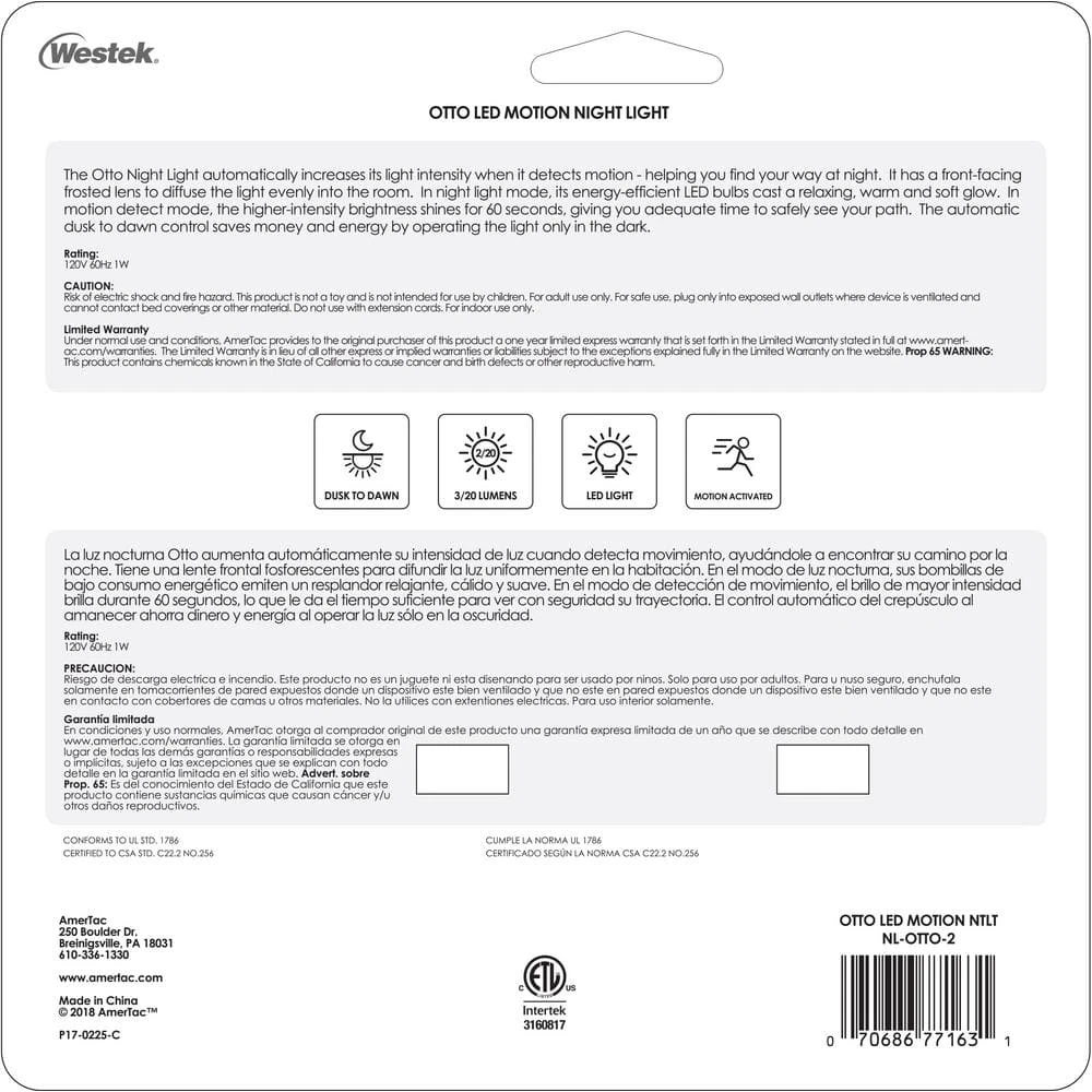 The Otto Dual Brightness Night Light is like two products in one. First, it’s a night light that’s always on in the dark, providing soft illumination. Then, when motion is detected, it boosts the light output for 60 seconds to help you see your path. In the dark, the light is always on between the two light levels. The contemporary style adds elegance to any room and projects light forward, adding safety and convenience in your home.
