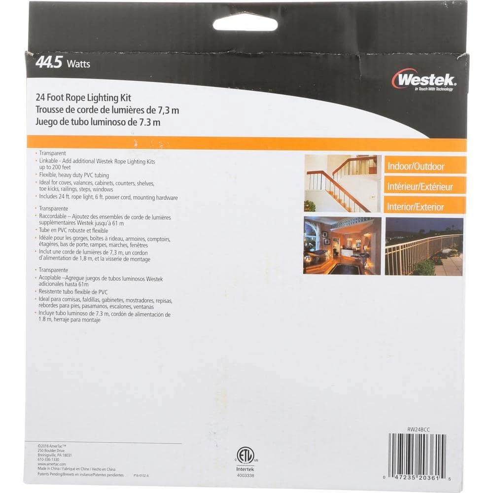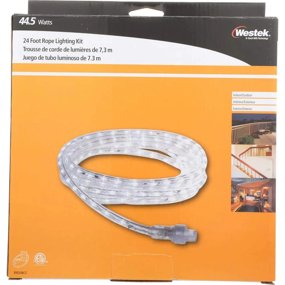 The Westek Indoor/Outdoor Incandescent Lights feature flexible, heavy duty, UV inhibiting PVC tubing that resists yellowing and cracking. Connect additional kits for up to 186 ft. of continuous light – just remove main rope light end cap, remove power cord from 2nd kit and screw the two together. Perfect for inside homes to line steps, bottom or top of cabinets, valances, sliding doors, windows or entertainment center. Commonly used outdoors to outline decks, patios, pathways, stairs.