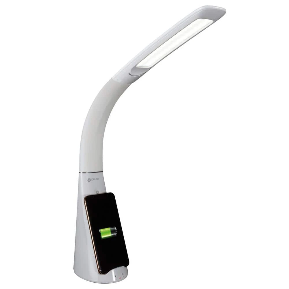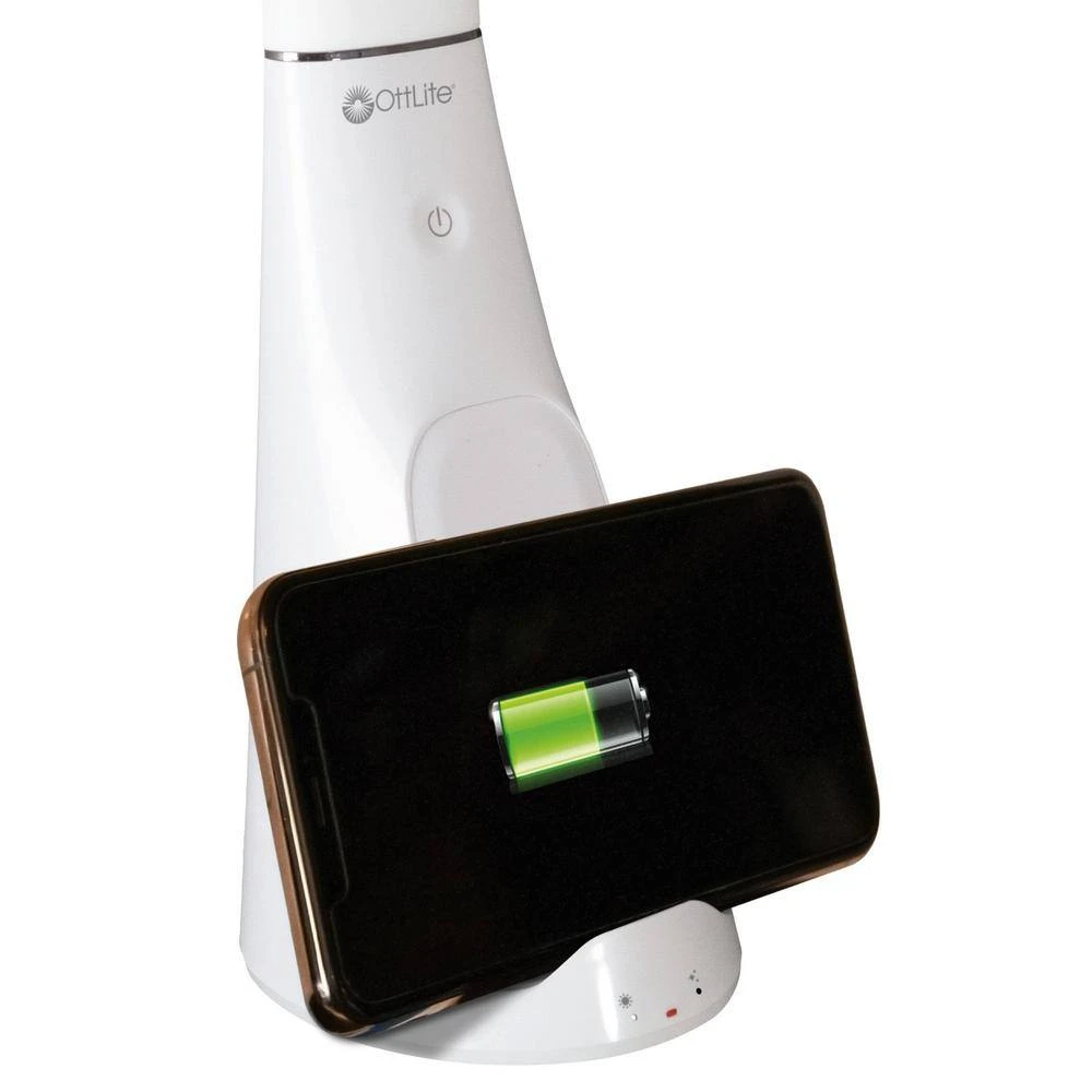 OttLite brings you the only desk lamps designed to break down harmful microorganisms. Now you can have proven sanitizing power right at your desktop with SpectraClean visible light disinfection. Using a precise formulation, SpectraClean’s patented technology has been shown to kill potentially harmful bacteria like those prevalent on mobile phones and desktops. Create a healthier workspace every time you turn on your light, The OttLite Purify LED Sanitizing Desk Lamp with Wireless Charging also features the eyestrain-reducing power of ClearSun LED technology – shown to reduce eyestrain by up to 51%. This exclusive low glare, high contrast illumination is as close to natural-daylight as you can get and has a superior color rendering index of 95 plus. Customize your lighting experience with 3 brightness settings and choice of modes including ClearSun Only, ClearSun + SpectraClean, and SpectraClean Only. Plus, keep your phone sanitized and charged with the Qi-wireless charging stand. Phones can be charged horizontally or vertically allowing you to answer texts, watch videos and more. 5V, 2.1A USB charging port also included for quickly charging mobile phones, tablets and other devices. Easily adjust height with the flexible neck from 14 in. to 26 in.