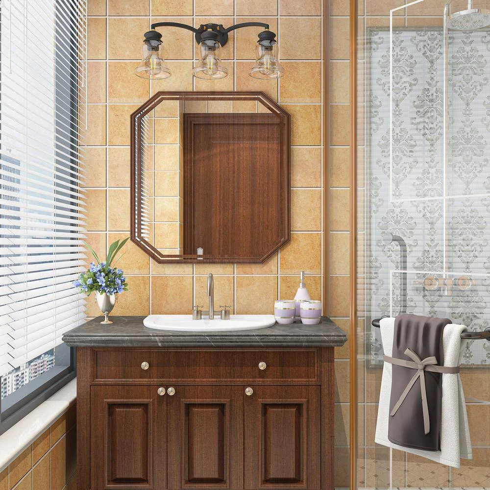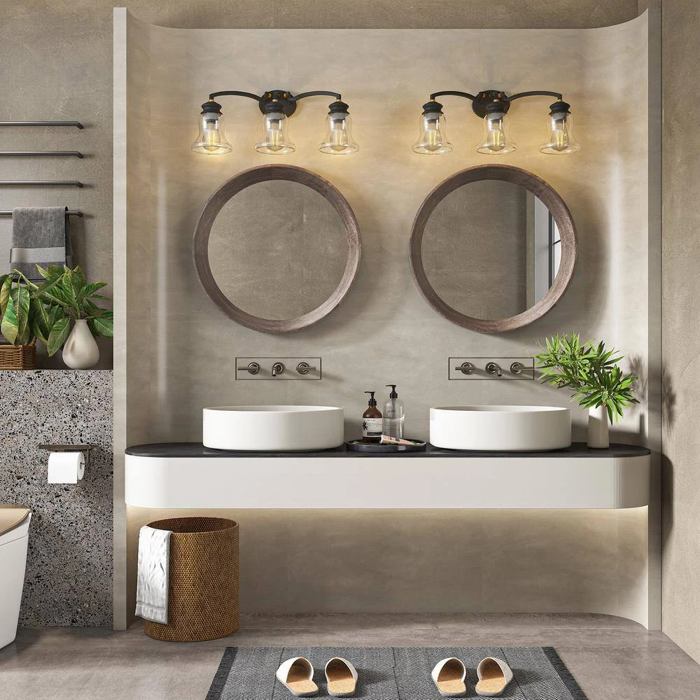 This Sabine 24 in. 3-Light vanity light exhibits traditional style vanity lighting that will upgrade your bathroom or powder room with elegant style for years to come. Features wine goblet shaped frosted glass shades with a clean design in antique bronze finish, sure to be a perfect addition in lots of aesthetic environments including transitional, traditional or farmhouse decor. This versatile vanity light can be mounted facing upwards or downwards for a customizable look, which will fit to any decor style.
