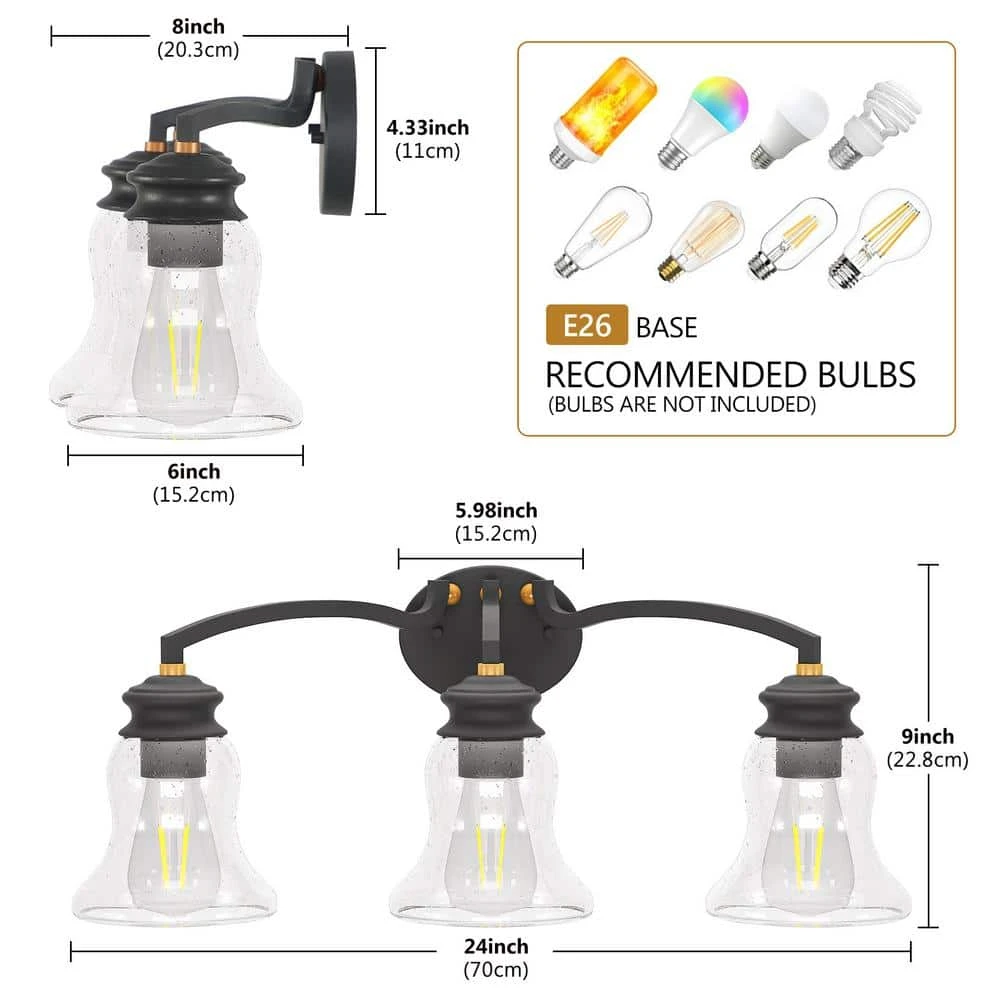 - Dimension: the light fixture is 24 in. W x 9 in. H, with the depth of the whole lamp is 8 in., this 3-light wall lamp will suit to different scenes to provide sufficient light