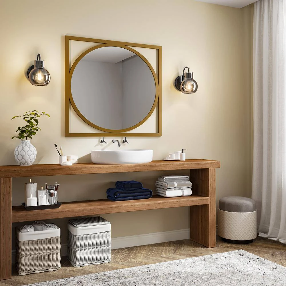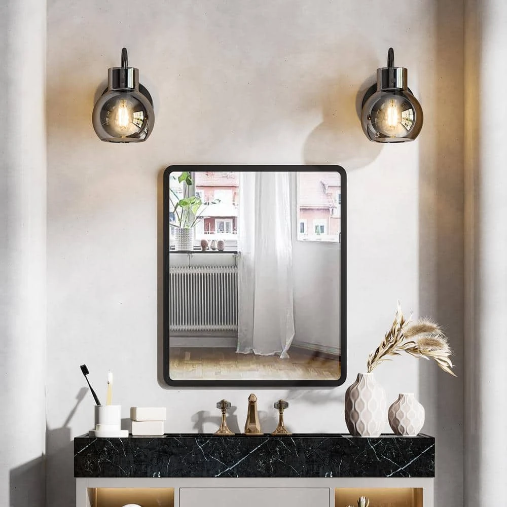 This elegant Modern Glass Ball Vanity Light from the Sabin collection adds form and function to your home. The plated smoky grey finish contrasts nicely with the matte black backplate. The clear glass ball shade offers a warm and inviting glow. Combining modern and industrial elements, this transitional light fixture is coated in high-quality finish, featuring a round backplate in a solid structure for a minimalist contemporary feel. There are a variety of Sabin collection vanity lights for you to choose from: 4-light/3-light/2-light/1-light, transparent/champagne/mirrored/etched/opaque shade color, ball/barn/cylinder/bell shade shape, glass/metal/alabaster shade material, black/silver/gold tube, etc. There is always a suitable model that fits you and your bathroom in TRIBESIGNS WAY TO ORIGIN lighting products.