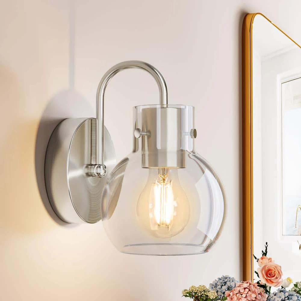 - 1. unique design: the 1-light vanity fixture is made of sturdy metal in polished nickel finish which no need to worry about getting oxidation and color fading, the clear glass bell shades offer a warm and inviting glow, combining modern and industrial elements, it features a slender linear bar in a solid structure for a minimalist contemporary feel
