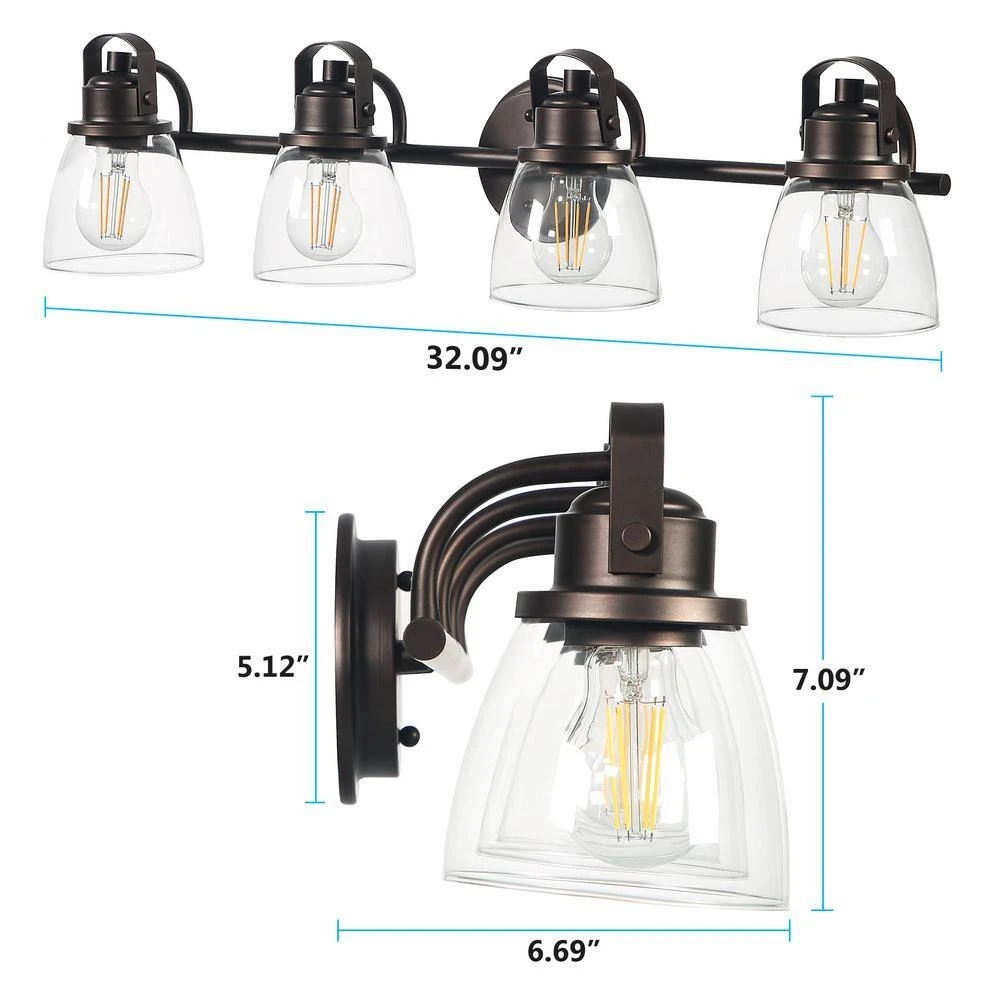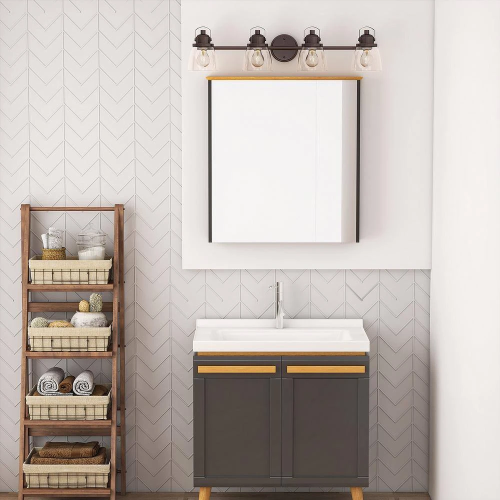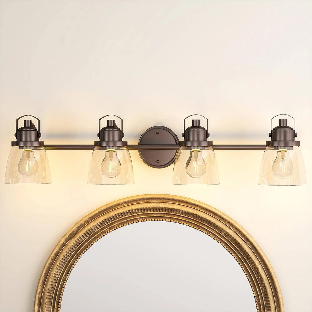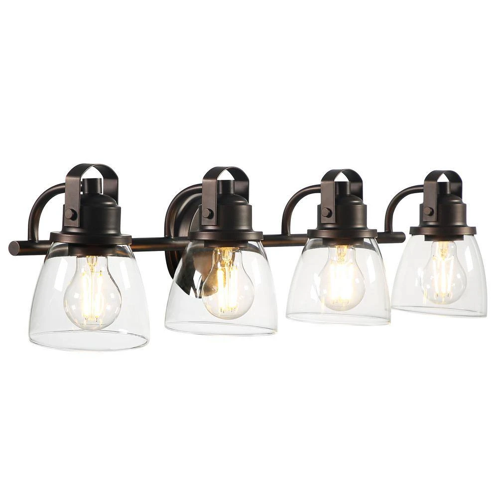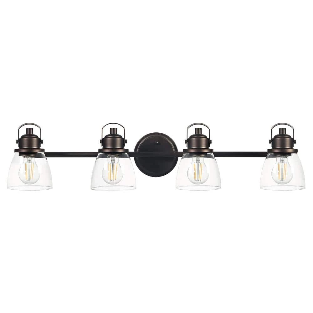 4-light bath vanity fixture featuring nautical, linear details and clear glass shades. Glass in a clean, simple bowl shape provides even, bright and delightful illumination. Sculptural forms of metal and glass are enhanced by a classic antique bronze finish. The nautical inspired Sadie Collection brings a touch of the seaside to your home.