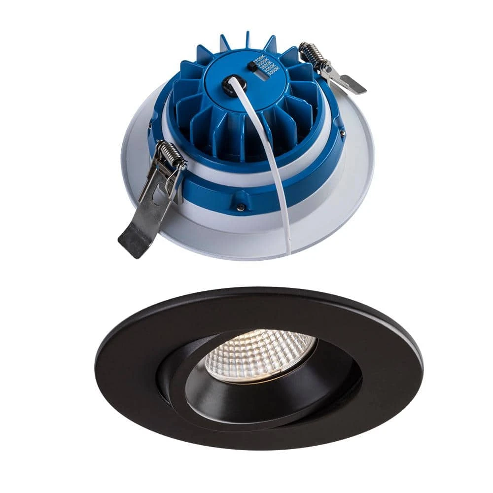 The 4 in. SPEX Lighting GIMBAL features a 12-Watt downlight with Selectable Color Temperature (27K, 30K, 35K, 40K, 50K) 360° rotation and 30° of tilt. It offers a sleek design with regressed optics for a quieter ceiling with less glare. No housing required, suitable for retrofit applications and wet locations. Quick connect push-in terminals for fast and easy wiring.