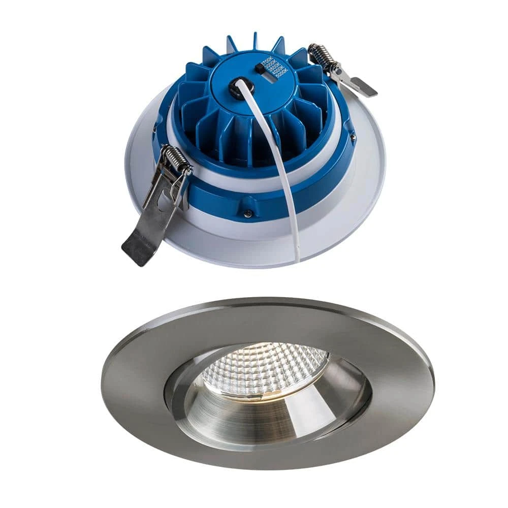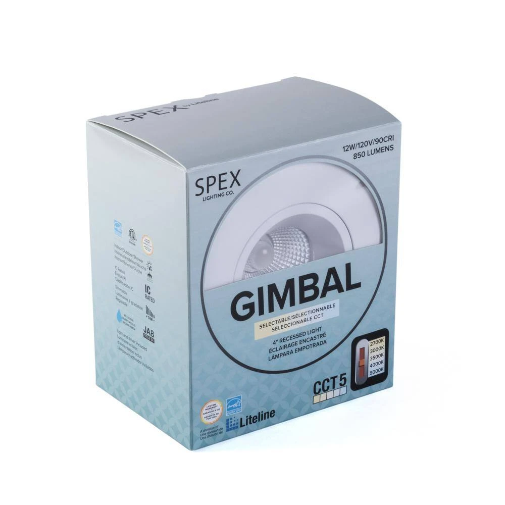 The 4 in. SPEX Lighting GIMBAL features a 12-Watt downlight with Selectable Color Temperature (27K, 30K, 35K, 40K, 50K) 360° rotation and 30° of tilt. It offers a sleek design with regressed optics for a quieter ceiling with less glare. No housing required, suitable for retrofit applications and wet locations. Quick connect push-in terminals for fast and easy wiring.