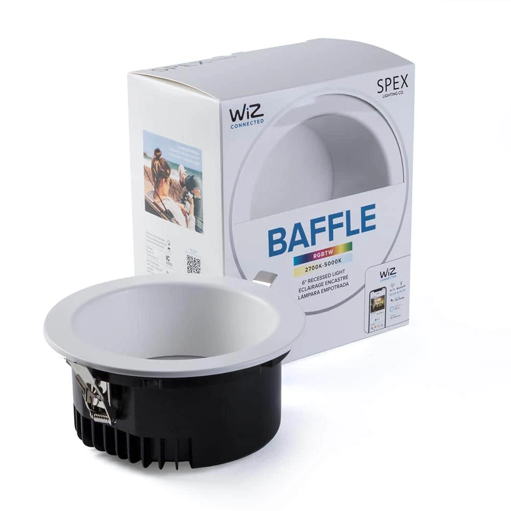 Connected by WiZ, the SPEX Lighting 6 in. Smart BAFFLE downlight fixture is Wet Rated, delivers 1520 Lumens in 16-Watt. Full Color and White Tuning (2700K – 5000K). with its Regressed Light for low glare and 80° Beam Spread enhances the look in your space. Control this Wi-Fi Fixture with either the SPEX Lighting Room Controller or WiZ App. Integrated it into your Smart Home Eco-system to work with Alexa, Google, Siri Shortcuts. SmartThings and IFTTT. Select Circadian Rhythms, Create your own Scenes or choose from Pre-set ones. Set Schedules or Vacation Mode to give you total control of the lights in your home. No Hub Required – Connects to a 2.4 GHz network.
