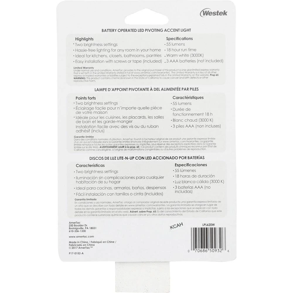 The Westek LPL620 LED Swiveling Puck Light provides the perfect opportunity to add accent lighting anywhere. The puck light provides 55 lumens of warm white illumination with simple one-touch On/Dim/Off operation and a swiveling head to allow you to adjust the light as needed. The kit includes all necessary installation accessories for easy installation. A clean modern design with a white finish makes these lights suitable for any decor. Each light takes 3 AAA batteries (not included). AmerTac manufacturing brands offer complete lines of distinctive decorative home accent products that include trend-setting wall plates, money saving LED night lights, innovative under cabinet lighting and LED battery operated lights. We also offer utility product lines including energy-saving timers, dimmers and lighting controls, as well as an extensive offering of consumer electronics accessories for the home and office.